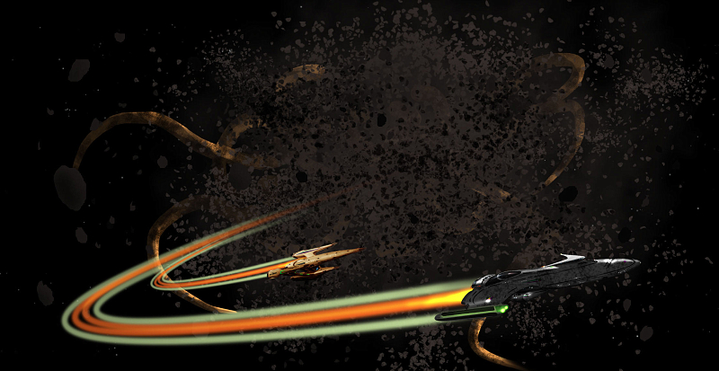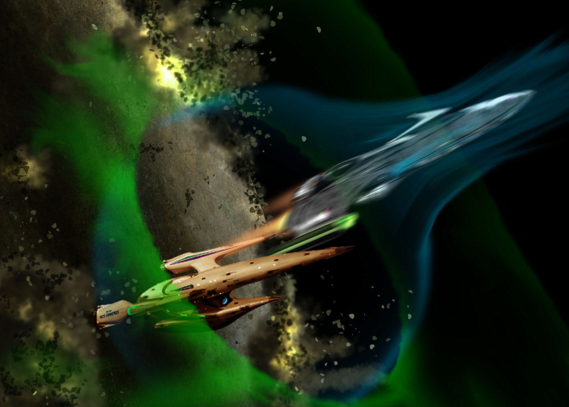 Teek was already reaching for the throttle as Joust gave the order, throwing it into full power, smashing Joust into the back of his chair once again. Shadowdancer shot back into the rock storm. This time, there were just too many to dodge entirely and the ship grazed a few on the way out. At last, the ship rocketed through the moon's entrance just before it collapsed, leaving the matter of the shield to deal with. Ahead was the Cerberus, holding position in the shield. An open door, but one with the Cerberus itself in the way.