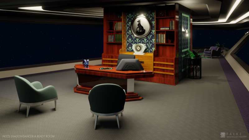 Shined and showered, he next retreated to his ready room, a place he hadn't managed to see yet, despite planning to go before the conference room meeting earlier. On approach, only one side of the doors slid open, leaving him to squeeze himself in sideways. Inside was about as he expected. Chairs thrown all around. Not a single book left on the shelves. His antique clock was likely somewhere, but not that he could see just yet. Most important to him was the Blue figure that he always kept on his desk. After some light searching, he found it, underneath his toppled desk chair. After a quick check, he was pleased that it appeared undamaged. After placing the figure back on his desk and flipping his chair upright, for the first time in months, something about the universe felt right again.