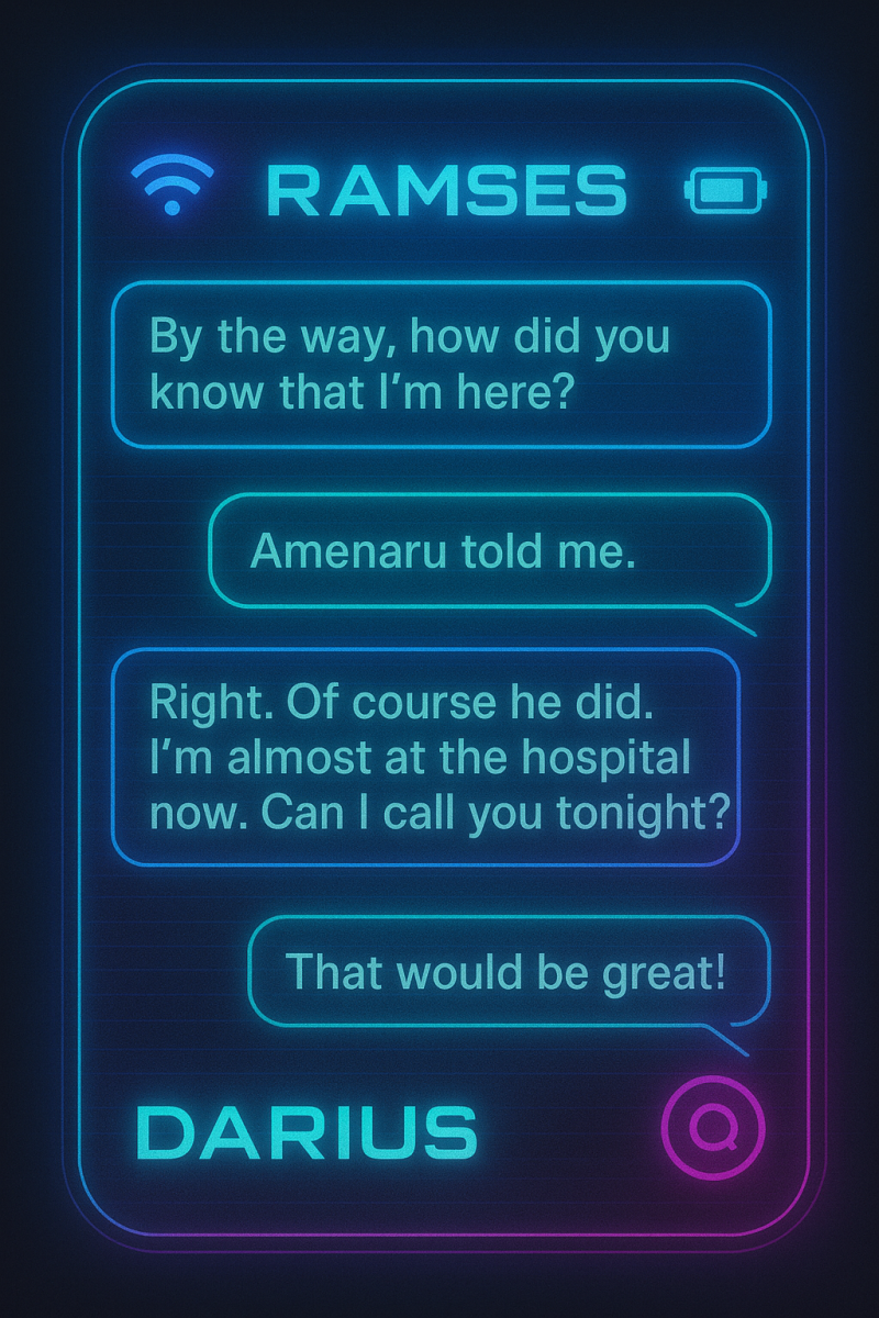 And the phone. The night before, after a few exchanges with Ramses by text, Darius suddenly realized how sleepy he was and konked out on the bed. He didn't even eat until ordering in breakfast that morning. Now, his head flipped back and forth between the city in front of him and the text message screen in his hand.